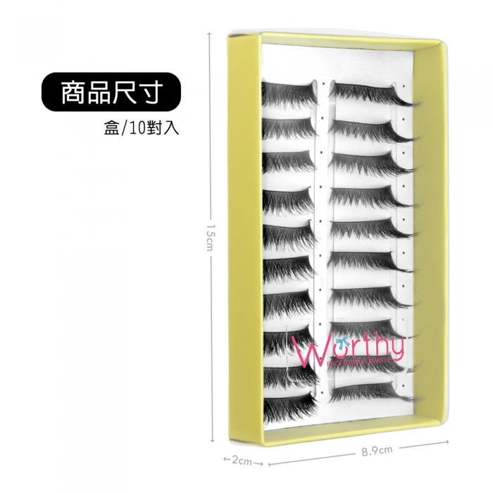 睫毛是眼睛深邃動人的主角,在整個彩妝中佔有很重要的角色,想有雙會說話水汪汪大眼,假睫毛是所有女孩缺一不可的!選擇品質好的假睫毛是非常重要的,無重力感不刺激眼皮又能展現迷人雙眸。不同款式創造不同眼妝,想要纖長濃密、捲翹翻天,或是打造娃娃無辜大眼,隨心所欲,Worthy假睫毛不易變形及損壞,戴起來與睫毛相互結合十分自然深獲許多婚紗業造型業彩妝師指定使用。注意事項:1.使用後若有過敏請即刻停止使用,並請教醫生。2.肌膚有傷口紅腫濕疹等現象時,請勿使用。3.使用中若感覺發癢刺激等異常現象發生時,請停止使用並洽詢皮膚科醫生。