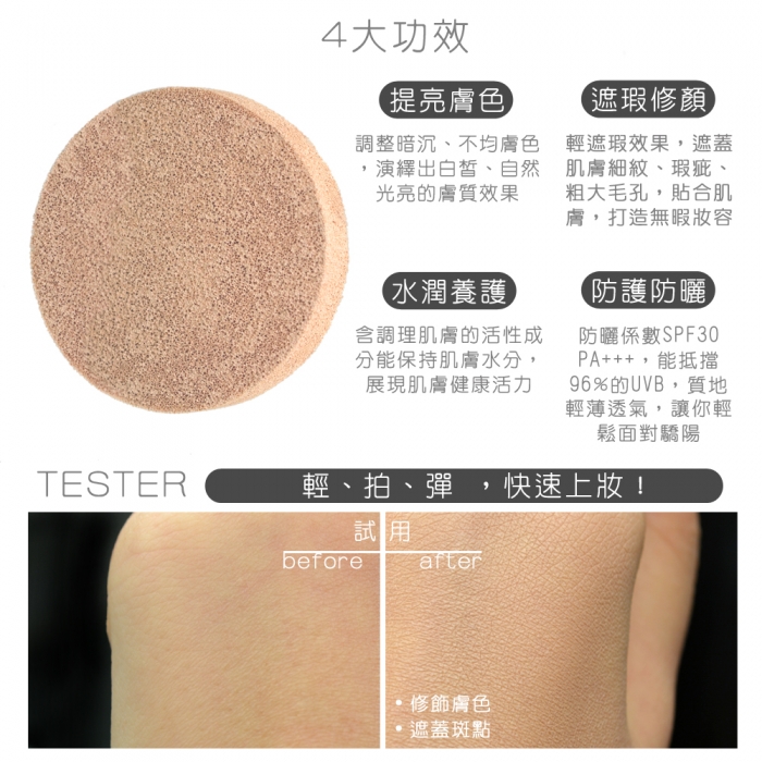 搭配不易吸水Q彈乳膠氣墊粉撲,沾取料體輕盈不沾黏,
