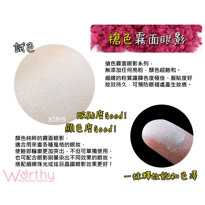 此款眼影為搶色霧面眼影系列,無添加任何亮粉,顏色超飽和。