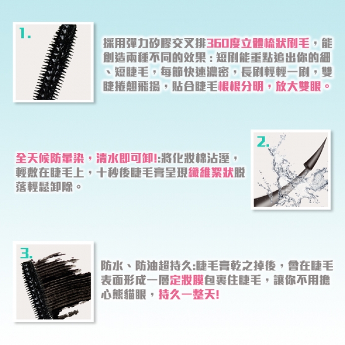 彈力矽膠交叉排360度立體梳狀刷毛,雙重效果。 短刷重點追出細、短睫毛,每節快速濃密, 長刷一刷,雙睫捲翹飛揚,貼合睫毛根根分明,放大雙眼。 全天候防暈染,清水即可卸! 十秒後睫毛膏呈現纖維絮狀脫落輕鬆卸除。 防水、防油超持久~ 睫毛膏乾後,形成定妝膜完美包裹住睫毛, 讓你不用擔心熊貓眼,持久一整天! ◎容量:8ml 用法:均勻塗刷於睫毛 注意事項: 1.使用後若有過敏情形,請立即停止使用,並諮詢醫生 2.請放置陰涼處,避免高溫、受潮,並密蓋以免變質。
