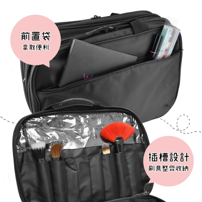 細緻帆布材質,耐用易清洗,大容量多層好分類; 插槽整齊收納化妝刷、透視網袋好尋物品、塑膠透明內袋防水防潮; 雙向拉練方便操作,附兩用背帶可肩背、後背, 攜帶不費力,彩妝師必備外出工具包~