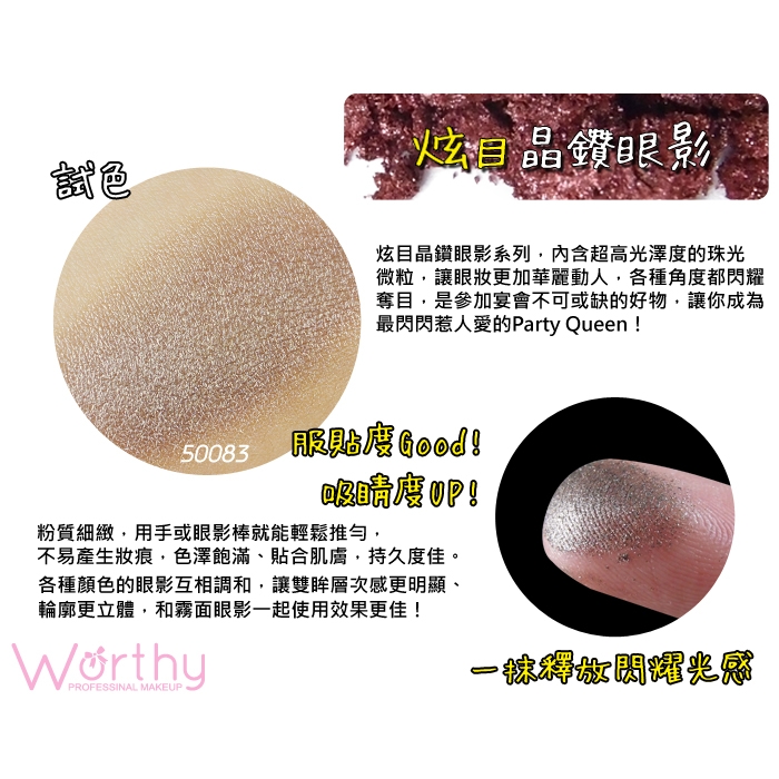 此款眼影為炫目晶鑽系列,內含超高光澤度的珠光亮粉,