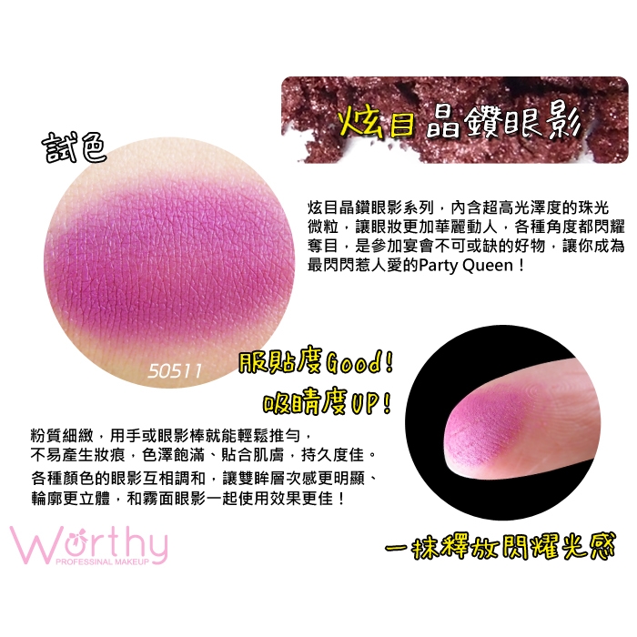 此款眼影為炫目晶鑽系列,內含超高光澤度的珠光亮粉,