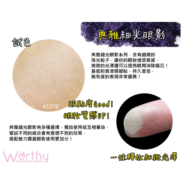 典雅細光系列,帶有點珠光微粒及細緻的亮片,在眼妝的表現之餘,微微的光澤還可以提亮眼周消除暗沉!基底粉質滑順服貼,持久度佳!