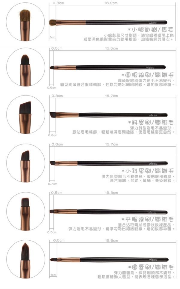 要完整呈現美麗的妝容,少不了各式各樣的彩妝工具, 每支刷具各司其職,是完美妝效的幕後英雄, 好的彩妝工具能輕鬆打造出自然、亮麗的妝容,為美麗動人指數加分! 【內容物】 餘粉刷 蜜粉刷 斜修容刷 腮紅刷 扁粉底刷 大斜眼影刷 中眼影刷 長眼影刷 小眼影刷 大眼影刷 眼窩刷 圓眼線刷 斜眉刷 小斜眉刷 平眼線刷 圓唇刷 睫毛捲 眉睫兩用刷 便攜圓唇刷 品名:Worthy-二十一支紫藕色彩絲壓紋刷具組 容量 : 二十一支刷具+刷套 貨號: W21