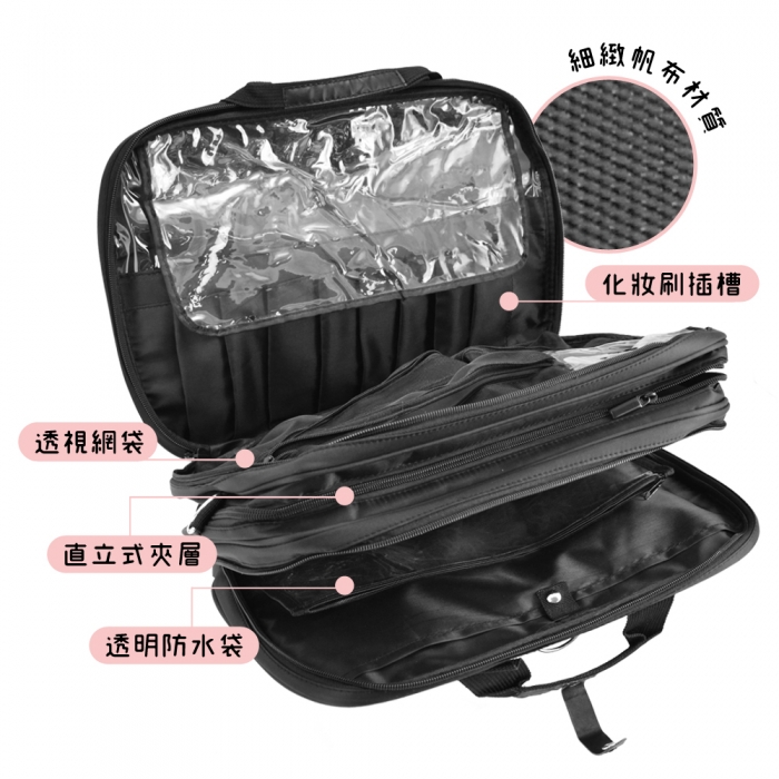 細緻帆布材質,耐用易清洗,大容量多層好分類; 插槽整齊收納化妝刷、透視網袋好尋物品、塑膠透明內袋防水防潮; 雙向拉練方便操作,附兩用背帶可肩背、後背, 攜帶不費力,彩妝師必備外出工具包~