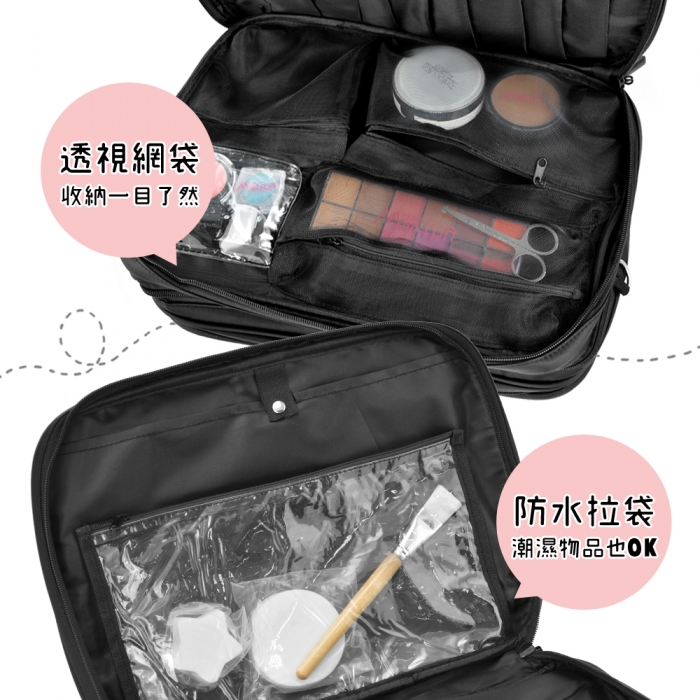 細緻帆布材質,耐用易清洗,大容量多層好分類; 插槽整齊收納化妝刷、透視網袋好尋物品、塑膠透明內袋防水防潮; 雙向拉練方便操作,附兩用背帶可肩背、後背, 攜帶不費力,彩妝師必備外出工具包~
