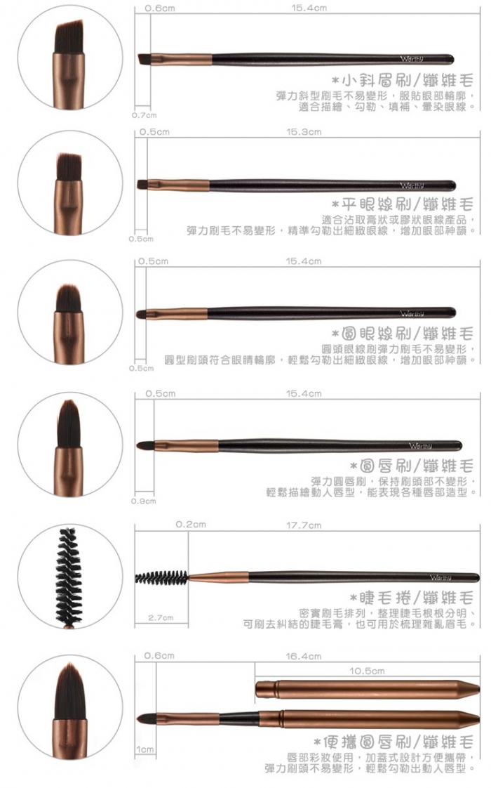 要完整呈現美麗的妝容,少不了各式各樣的彩妝工具, 每支刷具各司其職,是完美妝效的幕後英雄, 好的彩妝工具能輕鬆打造出自然、亮麗的妝容,為美麗動人指數加分! 【內容物】 腮紅刷 斜修容刷 扁粉底刷 大眼影刷 大斜眼影刷 中眼影刷 眼窩刷 長眼影刷 小眼影刷 斜眉刷 小斜眉刷 平眼線刷 圓眼線刷 圓唇刷 睫毛捲 便攜圓唇刷 品名:Worthy-十八支紫藕色彩絲壓紋刷具組 容量 : 十八支刷具+刷套 貨號: W18