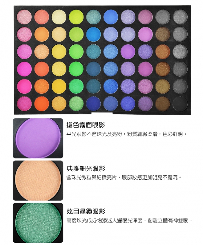 內含霧面、細光、晶鑽3類不同亮度的眼影,於不同場合、不同妝容使用,