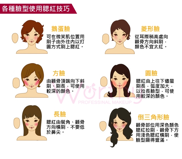 除了依造不同臉型有不同的腮紅畫法,也可依造膚色來使用腮紅