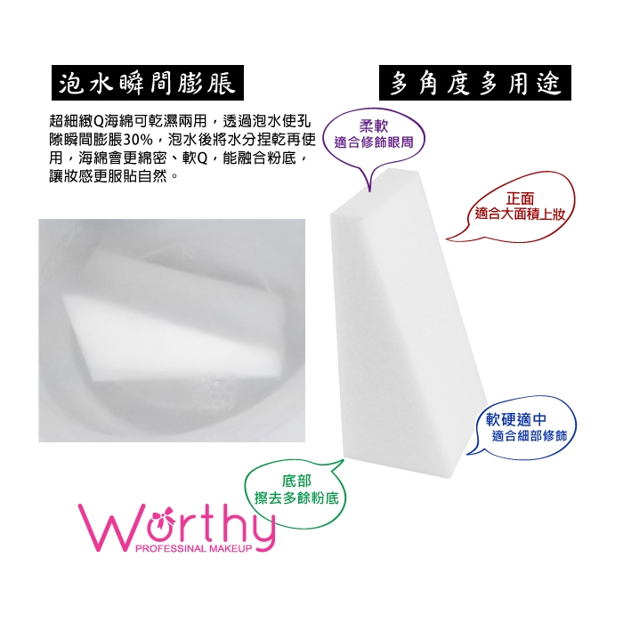 ●材質:超細緻高密度Q海綿 孔隙小、彈性佳、綿面柔軟細滑 ●觸感:未沾濕:手感扎實 / 沾濕後:手感軟綿 乾濕兩用皆可 海綿沾溼後吸附性更佳、上妝度更好在出水處下方以手掌握放海綿三至四次, 海綿可吸飽水分,無須長時間浸泡 ※好清洗,不卡粉:以洗面乳或溫和洗劑清洗 使用局部以推壓方式擠出殘留粉底再以清水沖淨即可 注意事項: *勿碰用尖銳物品或指甲以免高密度海綿破損,減短使用次數 *清洗時勿用搓揉方式以免撕裂海綿 *清洗後放置無日照通風處待風乾後使用.風乾後海綿將恢復比原尺寸稍大 ---------------------------------------------------------------------------------------------- 心得分享: 1.未加水打濕的超細緻Q海綿其手感扎實,使用在厚重粉底的表現 2.加水打濕的高密度海綿手感綿密且體積膨脹30%,使用面積加大且觸感柔軟無論在手上或臉上都無磨擦皮膚之負擔 3.因高密度孔隙小上粉底類無明顯痕跡,保濕度夠可延長上底妝的時間與完美服貼度 4.清洗容易:以洗面乳或溫和洗劑清洗,使用局部以推壓方式擠出殘留粉底再以清水沖淨即可