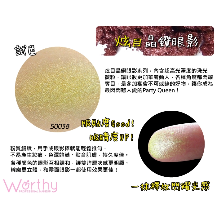 此款眼影為炫目晶鑽系列,內含超高光澤度的珠光亮粉,讓眼妝更加華麗動人,各種角度都閃耀奪目是參加宴會不可或缺的好物,讓你成為最閃閃惹人愛的Party Queen!