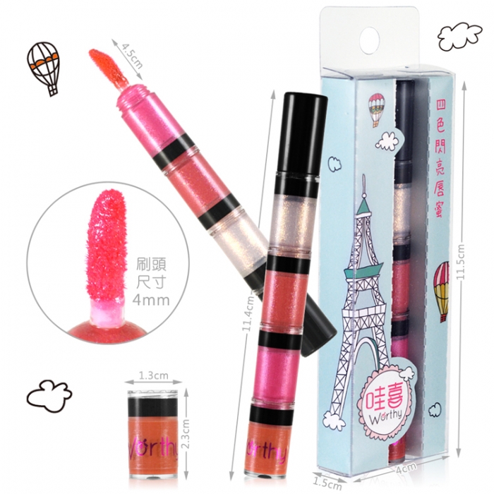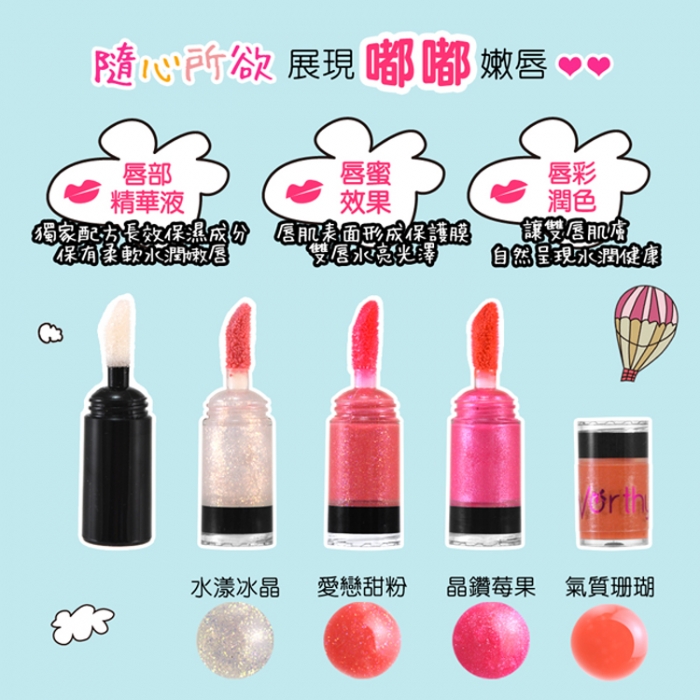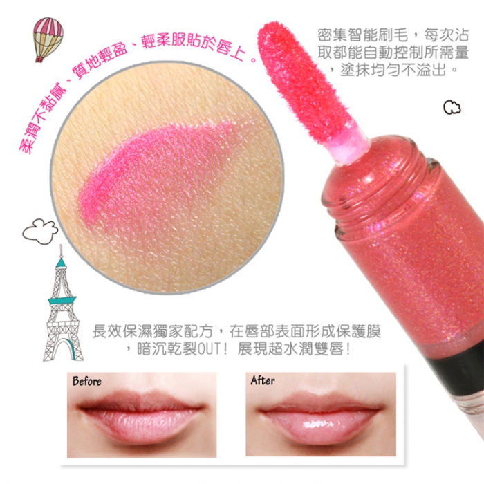 *4種色系一次擁有:水漾冰晶、愛戀甜粉、晶鑽莓果、氣質珊瑚 智能刷毛,自動控制所需量,塗抹均勻不溢出。 質地輕盈柔潤不黏膩,輕柔服貼於唇上。 長效保濕獨家配方,在唇部表面形成保護膜,暗沉乾裂OUT!