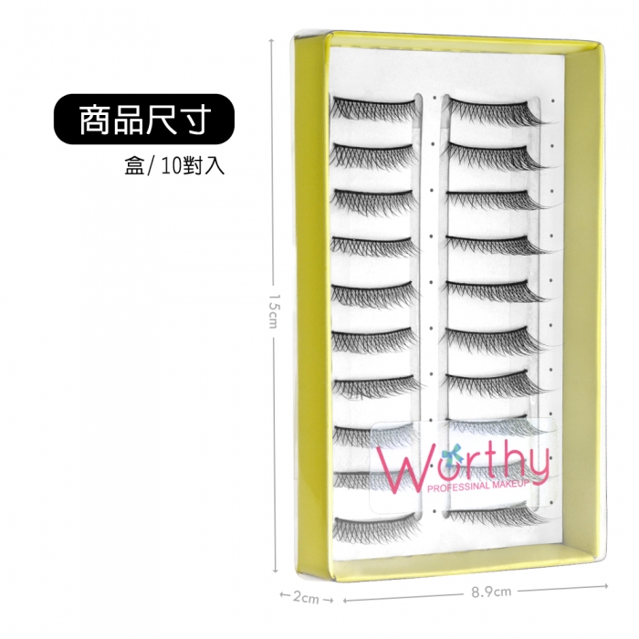 睫毛是眼睛深邃動人的主角,在整個彩妝中佔有很重要的角色,想有雙會說話水汪汪大眼,假睫毛是所有女孩缺一不可的!選擇品質好的假睫毛是非常重要的,無重力感不刺激眼皮又能展現迷人雙眸。不同款式創造不同眼妝,想要纖長濃密、捲翹翻天,或是打造娃娃無辜大眼,隨心所欲,Worthy假睫毛不易變形及損壞,戴起來與睫毛相互結合十分自然深獲許多婚紗業造型業彩妝師指定使用。 注意事項: 1.使用後若有過敏請即刻停止使用,並請教醫生。 2.肌膚有傷口紅腫濕疹等現象時,請勿使用。 3.使用中若感覺發癢刺激等異常現象發生時,請停止使用並洽詢皮膚科醫生。