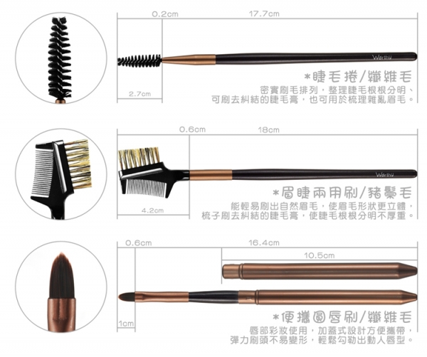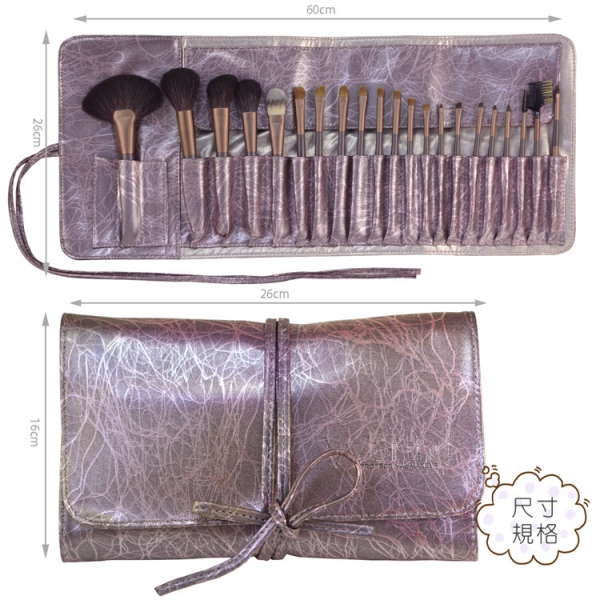 要完整呈現美麗的妝容,少不了各式各樣的彩妝工具, 每支刷具各司其職,是完美妝效的幕後英雄, 好的彩妝工具能輕鬆打造出自然、亮麗的妝容,為美麗動人指數加分! 【內容物】 餘粉刷 蜜粉刷 斜修容刷 腮紅刷 扁粉底刷 大斜眼影刷 中眼影刷 長眼影刷 小眼影刷 大眼影刷 眼窩刷 圓眼線刷 斜眉刷 小斜眉刷 平眼線刷 圓唇刷 睫毛捲 眉睫兩用刷 便攜圓唇刷 品名:Worthy-二十一支紫藕色彩絲壓紋刷具組 容量 : 二十一支刷具+刷套 貨號: W21